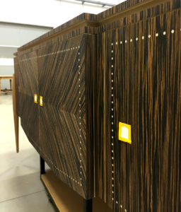 To reproduce this model faithfully it was necessary to do a great deal of research on materials. In order to get the most out of it, we needed slices of different veins of ebony and maple, European marble and sheets of pure white mother of pearl, materials frequently used in the gay yet sophisticated drawing-rooms of the haute bourgeoisie around the end of the First World War as a symbol of rediscovered affluence and modern elegance.