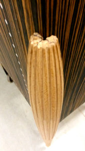 The characteristic cigar shape of legs have demanded the skills of a number of different craftsmen: the turner, who taked the unshaped billet and gived it the basic cylindrical shape, the shaper who chiselled out the grooves, and the wood-carver who smoothed and hand-finishes the shapes left by chisel and router.