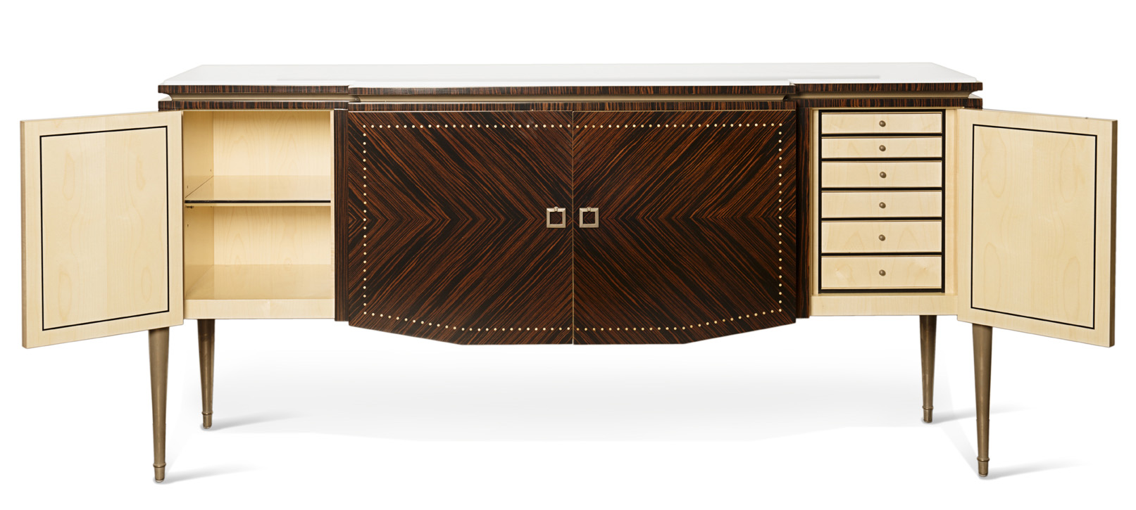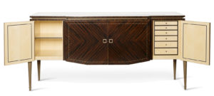 Behind the decoration of this piece, lies all the manual dexterity of our craftsmen. Slices of makassar-wood with different grain patterns were combined and fitted together by hand to create vertical streaking on the side doors and edges and a herring-bone motif on the central doors, inlaid with dots of purest mother-of-pearl.
